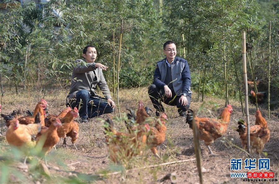 李寶強(右)在一戶百姓家了解林下養(yǎng)雞情況(2015年11月25日攝)。李寶強,眉山市青神縣瑞峰鎮(zhèn)天池村“第一書記”。為集中力量打好脫貧攻堅戰(zhàn),四川省選派1.5萬名優(yōu)秀機關(guān)干部到建檔立卡貧困村任職“第一書記”。黨的十八大以來,以習(xí)近平同志為總書記的黨中央高瞻遠矚、深謀遠慮,以高度的政治感、使命感和責(zé)任感,把扶貧開發(fā)工作提升至治國理政新高度,廣泛凝聚社會各界力量,推進實施精準(zhǔn)扶貧方略,為到2020年全面建成小康社會奠定堅實基礎(chǔ)。按照中央部署,通過產(chǎn)業(yè)扶持、轉(zhuǎn)移就業(yè)、易地搬遷、政策兜底等方式,到2020年將實現(xiàn)7017萬農(nóng)村貧困人口脫貧目標(biāo)。新華社記者 薛玉斌 攝