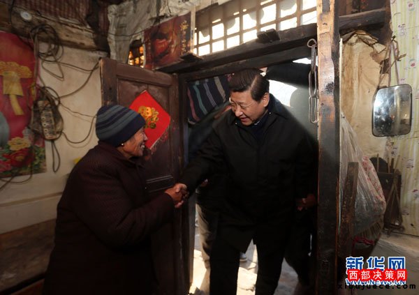 2012年12月29日至30日,中共中央總書記、中央軍委主席習近平在河北省阜平縣看望慰問困難群眾。這是習近平在龍泉關(guān)鎮(zhèn)駱駝灣村到困難群眾唐榮斌家看望。新華社記者蘭紅光攝