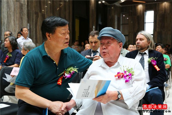 參加開幕式的著名老藝術(shù)家劉文西(圖右)和王西京親切交談。