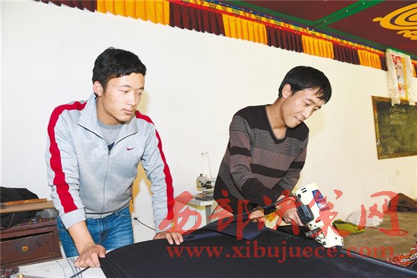 圖為曲水縣索朗雅卓縫紉農(nóng)民專業(yè)合作社的社員正在裁剪布料。