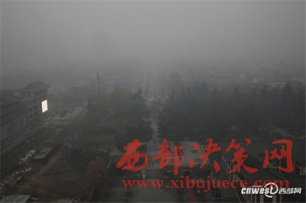 12月20日,西安市空氣質(zhì)量指數(shù)接近500,空氣質(zhì)量嚴(yán)重污染,昨日西安市首次啟動(dòng)重污染天氣Ⅰ級應(yīng)急響應(yīng),今日繼續(xù)執(zhí)行重污染天氣Ⅰ級應(yīng)急響應(yīng),幼兒園、中小學(xué)停課,機(jī)動(dòng)車限行50%。重度霧霾的大雁塔失去了千年古色,稍遠(yuǎn)一點(diǎn)看大雁塔若隱若現(xiàn),再走遠(yuǎn)一點(diǎn)大雁塔在視線中消失。登上大雁塔頂層,從東南西北四個(gè)窗口拍下的照片幾乎一模一樣。
