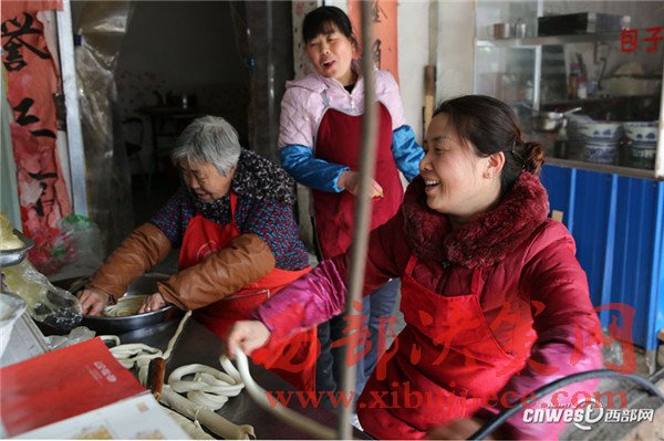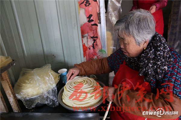 西安南二環(huán)附近的一條小巷里,新安醫(yī)院門口,70歲的賀玉蘭老人和兒媳劉艷寧在她們的實(shí)惠面館里忙碌著,揉面、拉條子、下面、給食客端面,婆媳倆默契得就像一個人,“二人成一心,黃土變成金。” 賀玉蘭老人喜歡老家蒲城的這句老話。