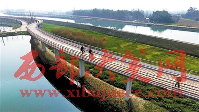 昨日上午,陽光明媚,記者來到剛剛建成的三道堰徐堰河濕地公園,河水清澈見底,河面上微風(fēng)吹拂,楊柳依依,白鷺飛翔,漣漪浪翻?,F(xiàn)場,一座飛架于河面兩側(cè)的“空中綠道”格外引人注目,三道堰鎮(zhèn)工作人員介紹,這座“空中綠道”南側(cè)全長891米,北側(cè)全長1300米,從空中俯瞰猶如雙龍飲水、長虹臥波,取名為“雙虹橋”。該橋?qū)?.5米,可供兩人并肩騎行,這條風(fēng)景獨(dú)特的“空中綠道”才建成開放,就已經(jīng)吸引了四面八方的游客前來體驗(yàn)新鮮,跑步的、散步的、騎行的市民絡(luò)繹不絕。“我們昨天晚上到了這里,橋面沿線彩燈四射,像極了夜空中的彩虹,太美了。”來自天府安公騎游俱樂部的熊大爺說,他們原計(jì)劃是一早返回成都,但因?yàn)檫@里的景色太美,一早便騎行到這里希望見到白天的景色。熊大爺在橋上向下望去,一處處水鄉(xiāng)田園美景映入眼簾,人們的跑步聲、嘖嘖的贊美聲傳入耳畔……“這樣的景色使人格外地陶醉!”