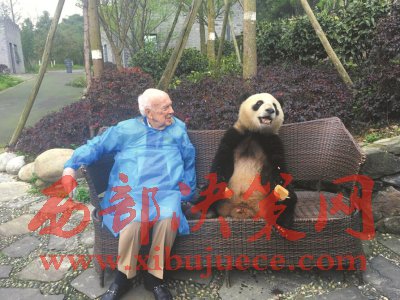 4月3日,中國大熊貓保護研究中心都江堰基地,詹姆斯·沃森博士與大熊貓親密接觸。