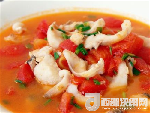 8、煮番茄魚骨這邊也關火,加少許鹽和雞精調味,把魚骨挑出扔掉,番茄和湯裝入盛器,把剛才滑熟的魚片放在面上,撒香菜上桌,可以開動了。