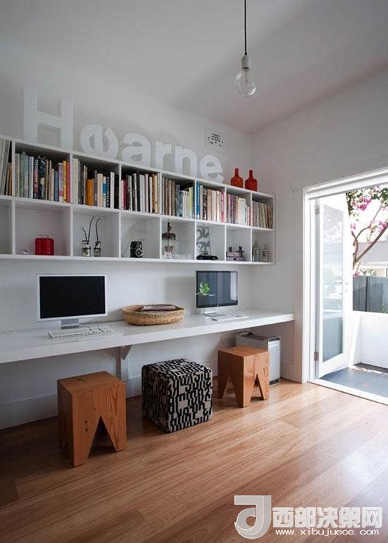 橫向延伸的書(shū)架與桌板,打造出了可供雙人使用的工作臺(tái),線條簡(jiǎn)潔流暢,也能讓兩個(gè)人毫無(wú)障礙地溝通交流。