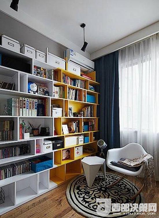 兩種不同顏色的書(shū)架拼接在一起,錯(cuò)落的收納格讓小小書(shū)房顯得活潑而有層次感。一把單人椅,讓人能夠享受安靜閱讀時(shí)光。