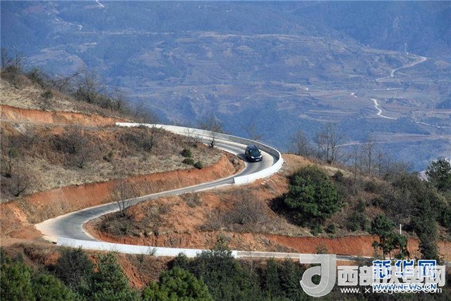 汽車在尋甸回族彝族自治縣功山鎮(zhèn)一條盤山公路上行駛(2月19日攝)。