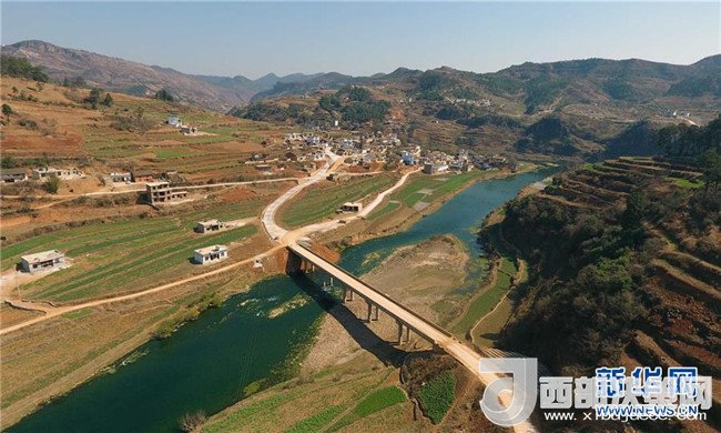 回族彝族自治縣河口鎮(zhèn)沙谷渡小村跨越牛欄江的橋梁和公路(2月20日攝)。