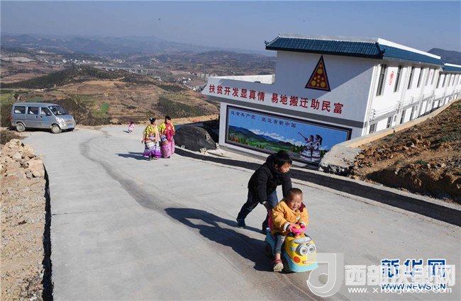 在尋甸回族彝族自治縣河口鎮(zhèn)窯灣子村,兩名兒童在混凝土硬化路上玩耍(2月20日攝)。