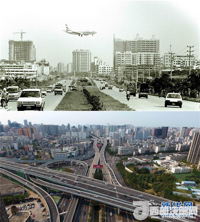 拼版照片為??谑旋埨ツ下方裎魧Ρ龋ㄉ蠄D為1993年6月30日新華社記者姜恩宇攝,下圖為2018年4月14日新華社記者郭程攝)。