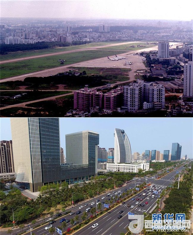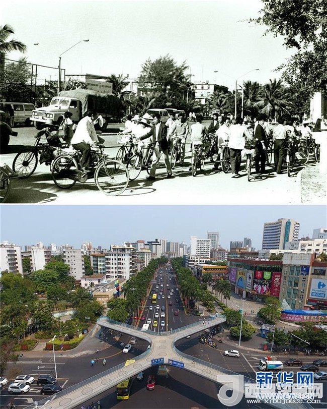 拼版照片為??谑泻8方裎魧Ρ龋ㄉ蠄D為1988年12月新華社記者姜恩宇攝,下圖為2018年4月14日新華社記者郭程攝)。