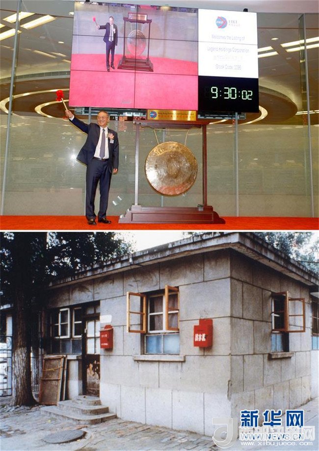 拼版照片:上圖為2015年6月29日,聯(lián)想控股在香港整體上市,聯(lián)想控股董事長、聯(lián)想集團(tuán)創(chuàng)始人柳傳志敲鐘;下圖為1984年,柳傳志等11位科研人員在一間不足20平方米的小平房(中科院計算所傳達(dá)室)中創(chuàng)辦了聯(lián)想。 新華社發(fā)