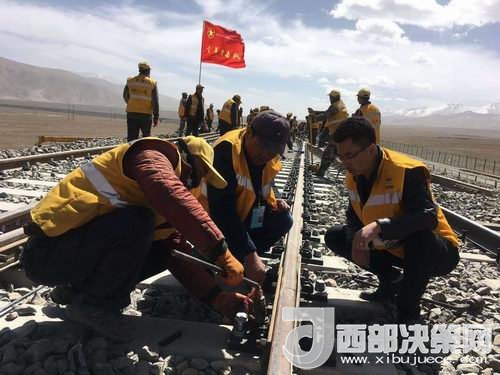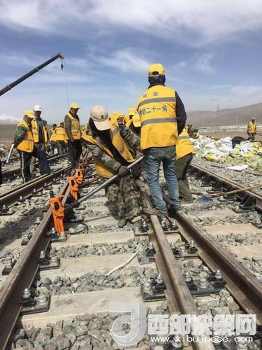 在玉珠峰車站施工現場,600余名工人正在緊張的進行螺紋道釘錨固定、搗道石、安裝枕木連接板等操作。橘黃色的工作服在遠處皚皚雪山的映照下分外醒目和溫暖。中鐵二十一局格拉擴能改造工程指揮部總工李先告訴記者:“這個車站的改造由車站北側增加2條到發(fā)線,在車站的西側增加3股道的專用裝卸線。涉及到路基、橋涵、房建、軌道、通信、信號、電力7個專業(yè)。”