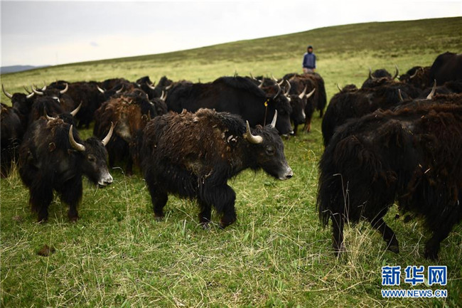 6月13日,在河南蒙古族自治縣賽爾龍鄉(xiāng)蘭龍村雪多牦牛繁育基地,牦牛在草場(chǎng)上覓食。新華社記者 張宏祥 攝
