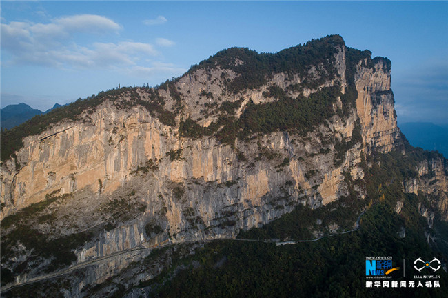 在重慶市開州區(qū)滿月鄉(xiāng)雙坪村,一段595米的鄉(xiāng)村公路頗為特殊,被稱為“懸崖天路”。新華網(wǎng) 李相博 攝
