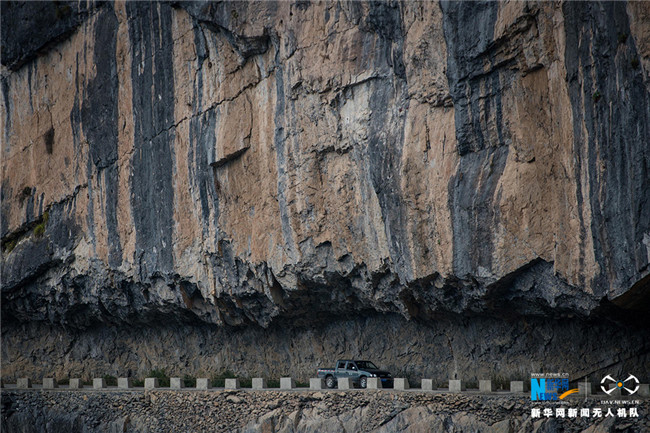 經(jīng)過一年多的時(shí)間,村民終于人工鑿出這條595米的懸崖公路,給當(dāng)?shù)貛砹讼M?。新華網(wǎng) 李相博 攝