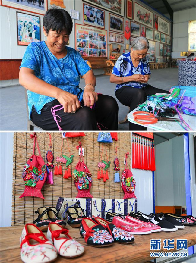 拼版照片(8月22日攝):上圖在山東費縣朱田鎮(zhèn)崔家溝社區(qū)的居家靈活就業(yè)培訓(xùn)中心,當(dāng)?shù)卮迕裨诳p制手工飾品;下圖當(dāng)?shù)卮迕窨p制的手工飾品和布鞋(8月22日攝)。崔家溝村是遠近聞名的“光棍村”“貧困村中的貧困村”。2016年3月,崔家溝村在中央異地搬遷政策的扶持下,實現(xiàn)了整體搬遷,1600多口人搬到了鎮(zhèn)駐地。從此,昔日的“光棍村”,一躍進入朱田鎮(zhèn)富裕村行列。新華社記者 王南 攝