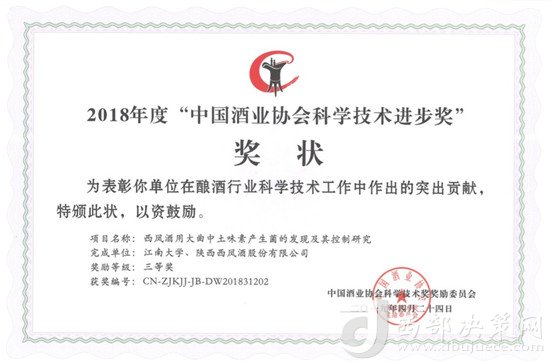 西鳳酒用大曲中土味素產(chǎn)生菌的發(fā)現(xiàn)及其控制研究獲科學(xué)技術(shù)三等獎(jiǎng)