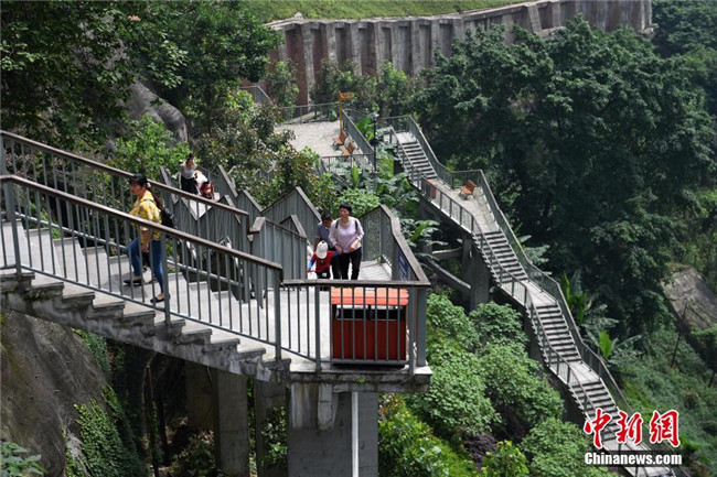 重慶一小區(qū)與半坡棧道相連,吸引市民前往體驗(yàn)。中新網(wǎng) 周毅 攝