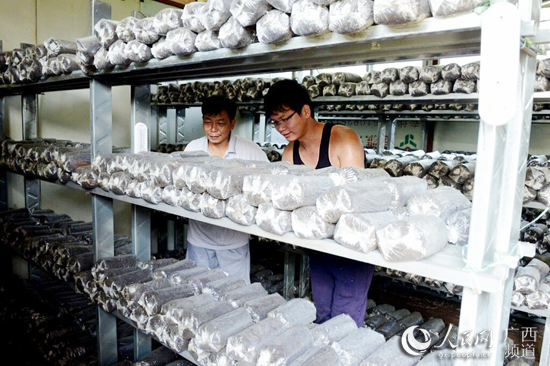 吳永振(右)檢查營養(yǎng)袋接種生長情況