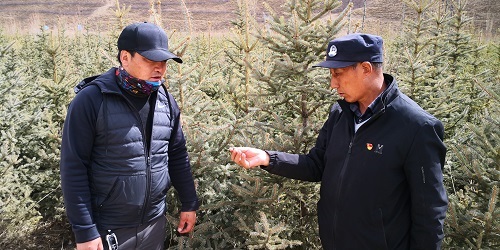 林業(yè)人員在高原千畝林木良種繁育實驗基地查看樹苗情況。 楊陽攝