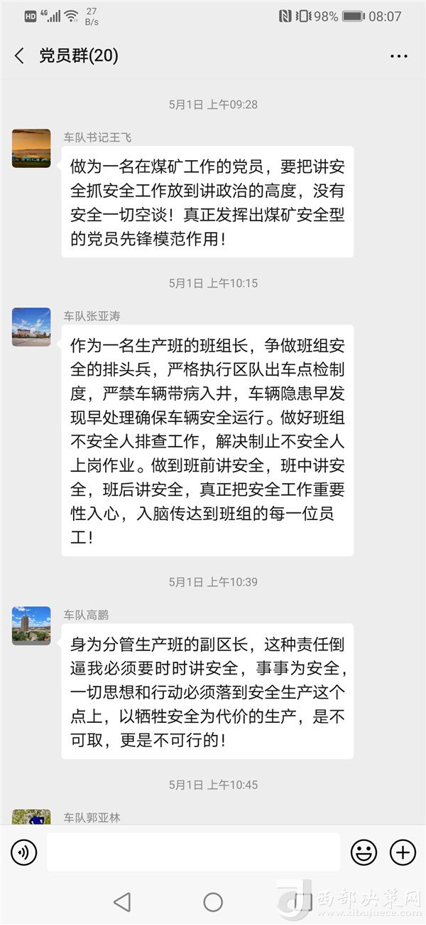 活動期間,支部20名黨員認(rèn)真學(xué)習(xí)貫徹集團(tuán)公司、陜北礦業(yè)公司和公司近期安全生產(chǎn)文件材料宣貫落實(shí)精神,深刻吸取安全生產(chǎn)事故教訓(xùn),圍繞“守住安全生產(chǎn)這一‘生命線’,牢固確立‘四個(gè)最’的意識”工作目標(biāo),展開了圍繞分管業(yè)務(wù)、自身崗位特點(diǎn)的討論學(xué)習(xí)。此次主題黨日活動,支部黨員紛紛談體會、講心得,結(jié)合工作中遇到的經(jīng)典案例,剖析了自身工作存在的短板和不足,并提出了具體的改進(jìn)措施。同時(shí),表示在今后工作中將充分發(fā)揮黨員的先鋒模范作用,擔(dān)當(dāng)作為、履職盡責(zé),做到帶頭反三違、帶頭降三違、身邊無三違。