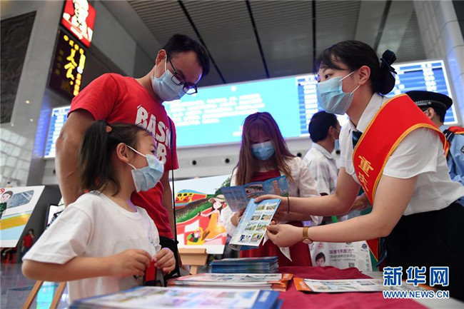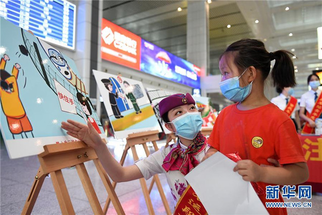 5月25日,在重慶北站北廣場(chǎng)候車(chē)廳,鐵路工作人員向小朋友宣講鐵路安全知識(shí)和疫情防控知識(shí)。新華社記者 唐奕 攝