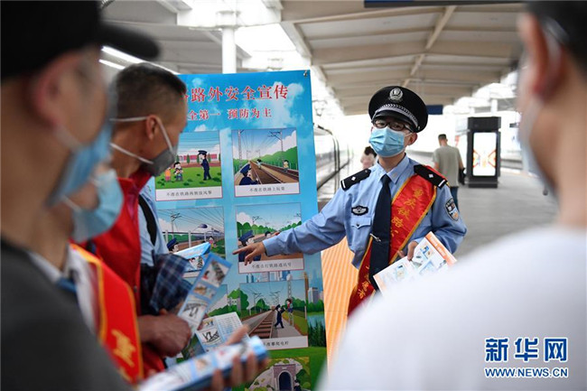 5月25日,在重慶北站北廣場(chǎng)站臺(tái),鐵路工作人員向旅客宣講鐵路安全知識(shí)和疫情防控知識(shí)。新華社記者 唐奕 攝