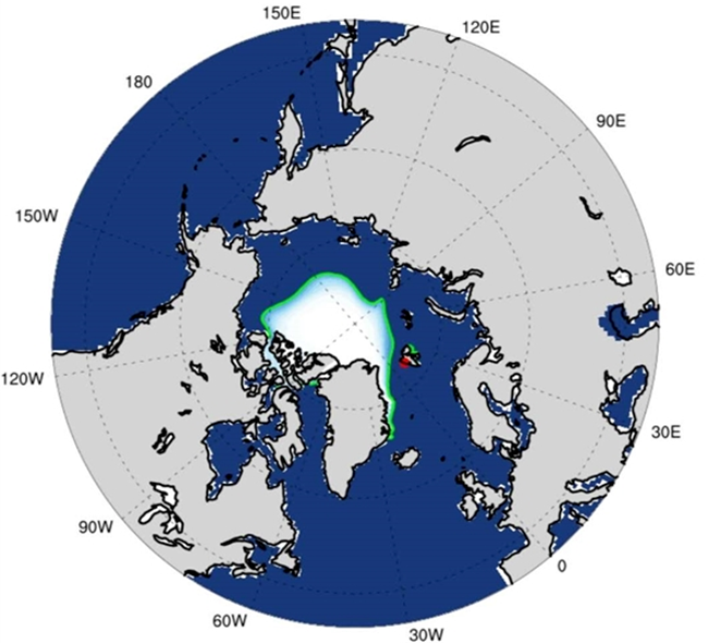 ▲中科院大氣物理研究所ANSO IAP-LASG北極海冰動(dòng)力集合預(yù)測(cè)系統(tǒng)6月份發(fā)布的9月份北極海冰范圍預(yù)測(cè),綠色實(shí)線為預(yù)測(cè)的北極海冰范圍,白色區(qū)域?yàn)楹1鶇^(qū)域。圖片來源:中國(guó)科學(xué)報(bào)