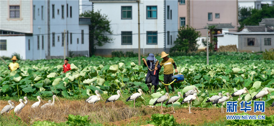 近日,云南省彌勒市竹園鎮(zhèn)農(nóng)民在荷田間勞作,不遠處許多鉗嘴鸛在田邊地頭棲息覓食,一幅人鳥和諧的生態(tài)畫卷徐徐展開。2006年,中國在云南大理首次記錄到鉗嘴鸛。近年來,隨著生態(tài)環(huán)境不斷改善,云南多地均發(fā)現(xiàn)鉗嘴鸛。新華網(wǎng)發(fā)(普佳勇攝影報道)