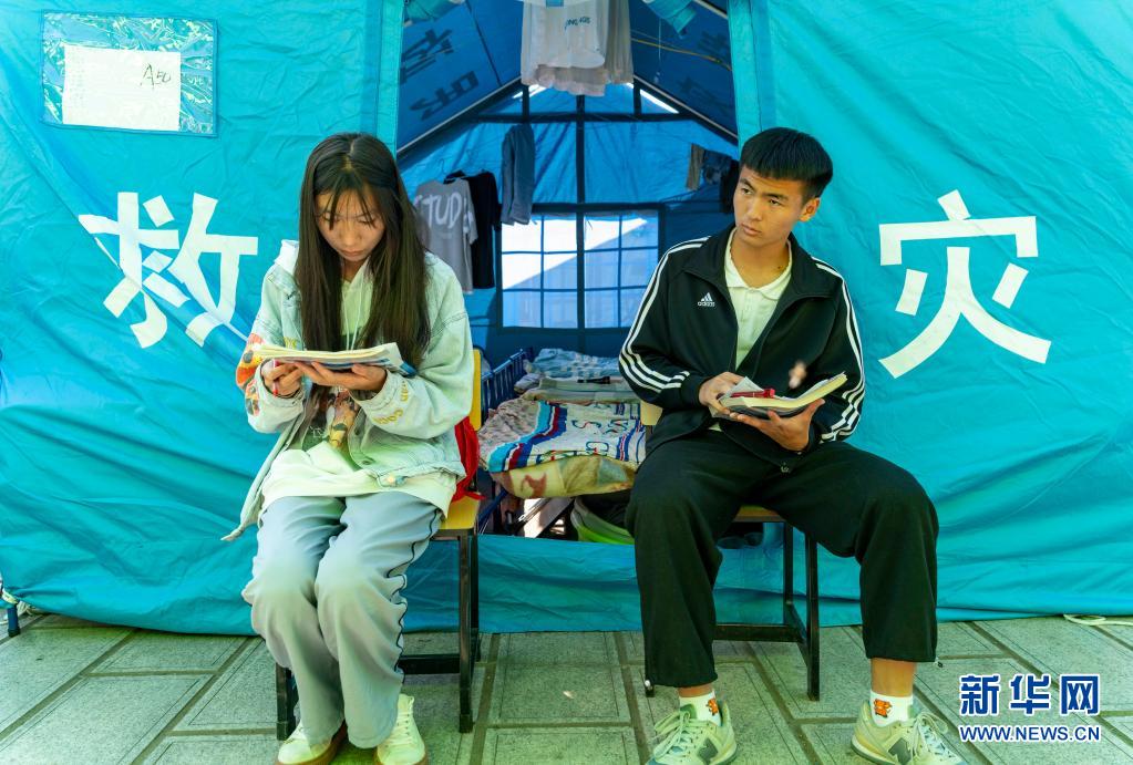 5月24日,漾濞一中兩名高三年級學生在帳篷前聽課。新華社記者陳欣波攝