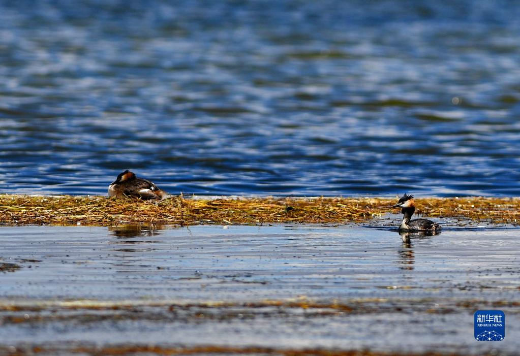 瑪旁雍錯湖面上的鳳頭䴙䴘(8月2日攝)。新華社記者 張汝鋒 攝