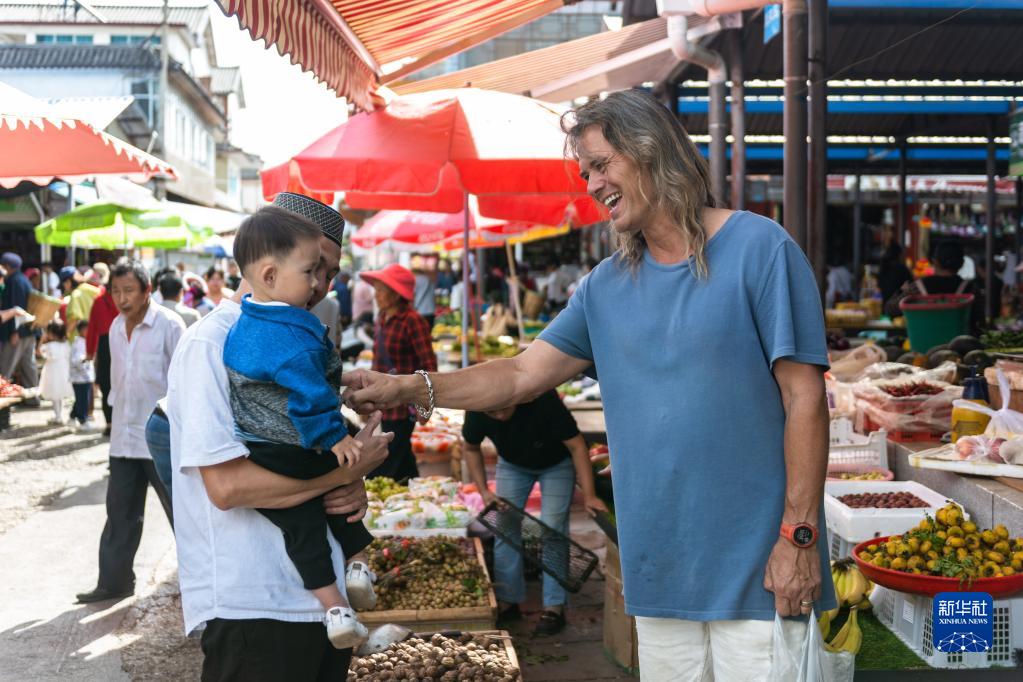 8月28日,林登在喜洲古鎮(zhèn)早市和小朋友打招呼。新華社記者 曹夢(mèng)瑤 攝