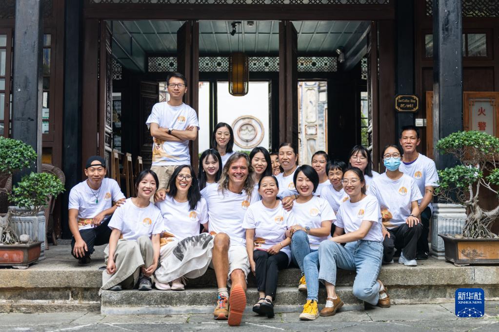 8月28日,林登和妻子瑾妮與喜林苑團(tuán)隊(duì)在云南省喜洲古鎮(zhèn)喜林苑合影。新華社記者 曹夢(mèng)瑤 攝